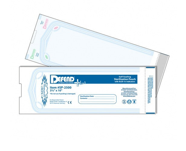 - Mydent SP0250 Defend Plus Self Sealing Sterilization Pouches 2.25" X 2.75" 200/Box Mydent SP0250 Defend Plus Self Sealing Sterilization Pouches 2.25" X 2.75" 200/Box